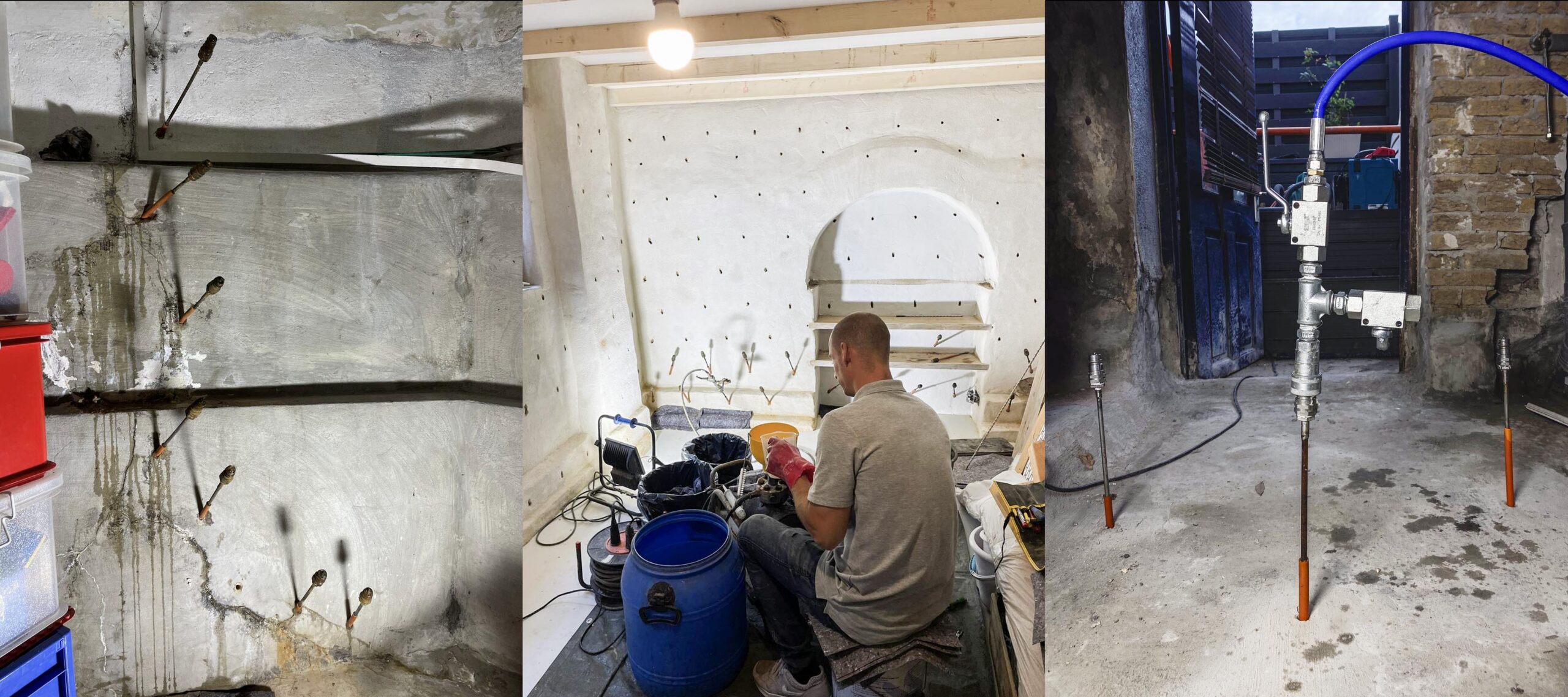 Een lekkende keldermuur wordt onder hoge druk geïnjecteerd met een speciale vloeistof die waterdun in de muur wordt aangebracht. Deze vloeistof verspreidt zich diep in de steen en aanwezige scheuren en slaat vervolgens om tot een waterdicht scherm in en achter de constructie. Hiermee wordt de waterinlaat van binnenuit permanent gestopt, zonder ingrijpende breekwerken.