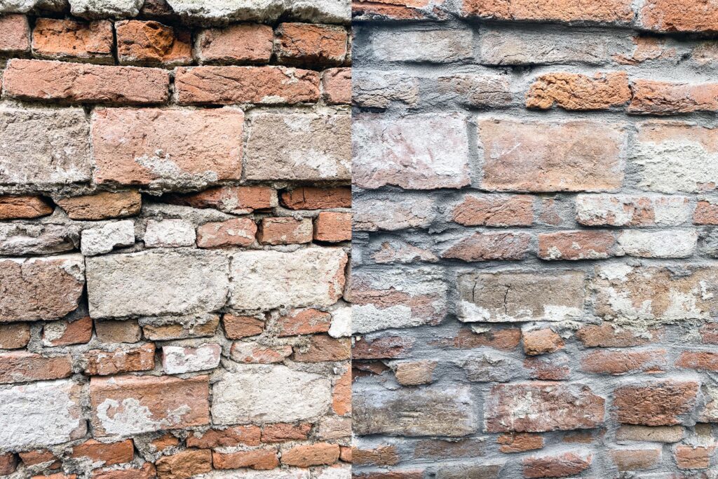 Na het zorgvuldig ontgraven van de gevel zijn de muren volledig schoon gespoten om vervuiling en losse delen te verwijderen. Daarbij werd zichtbaar dat het metselwerk poreus was en dat meerdere voegen in slechte staat verkeerden. Ook troffen we een oude doorvoer aan die vermoedelijk een belangrijke oorzaak was van de lekkage. Deze is afgezaagd en professioneel afgedicht. Vervolgens zijn de voegen opnieuw aangebracht, waarna de ondergrond is voorzien van een voorstrijk en hechtlaag.