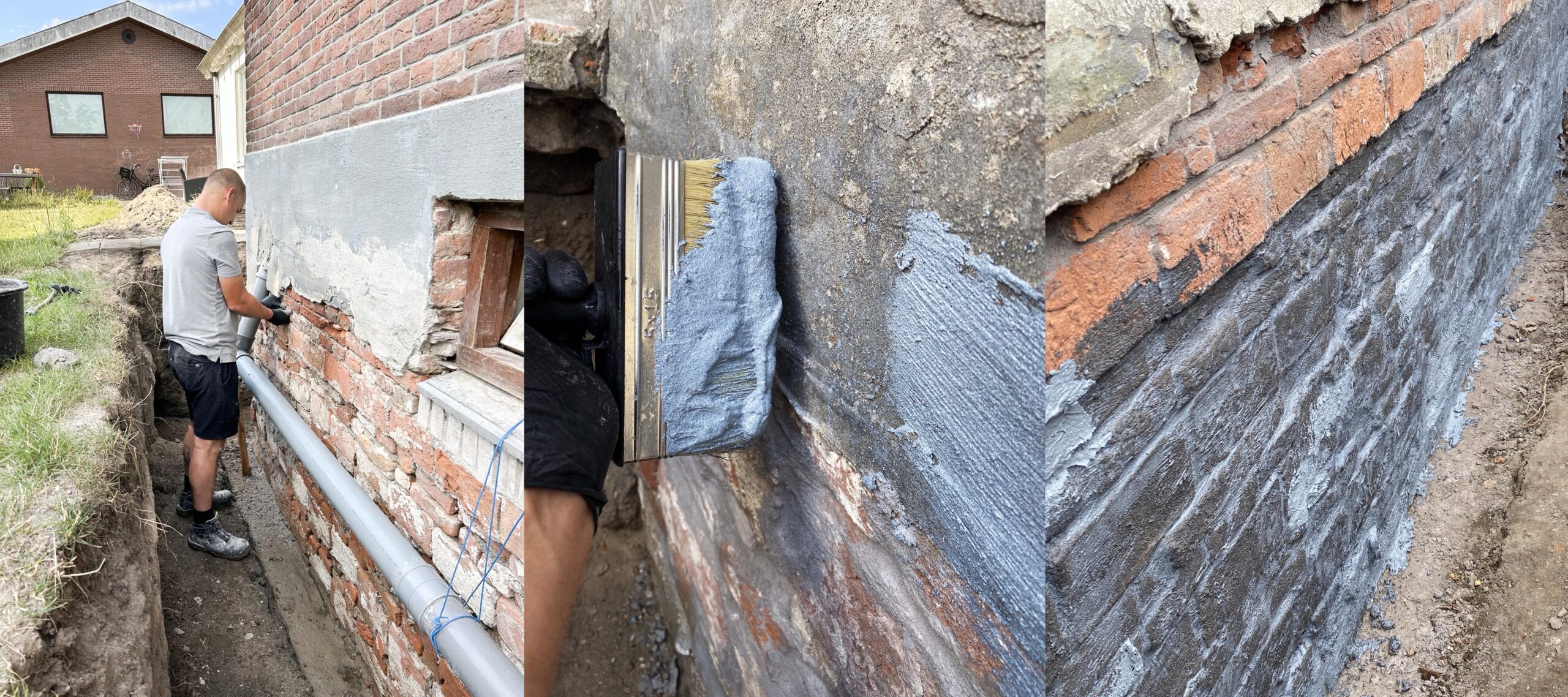 Aansluitend is een dubbele keldercoating aangebracht, met 24 uur droogtijd tussen beide lagen, zodat een duurzame en gesloten beschermlaag tegen grond- en regenwater ontstond. Doordat de gevel volledig vrij lag, kon het systeem zorgvuldig en onder optimale omstandigheden worden opgebouwd. Na afronding van onze werkzaamheden hebben de stukadoors het werk weer opgepakt en is de spatstrook opnieuw gestuct, zodat ook de afwerking netjes is hersteld.